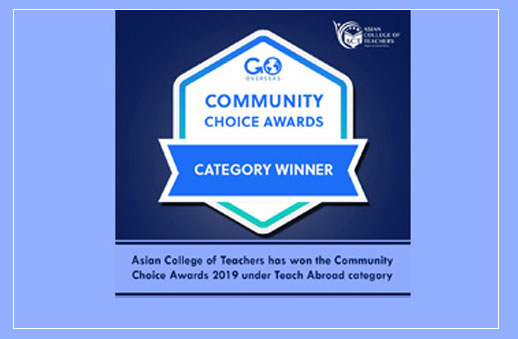 Asian College of Teachers (ACT) takes pride to announce that it has been chosen a winner in the prestigious Community Choice Awards 2019 (Teach Abroad category) by www.gooverseas.com where winners were selected by 1,000,000+ strong community, based solely on their program reviews.